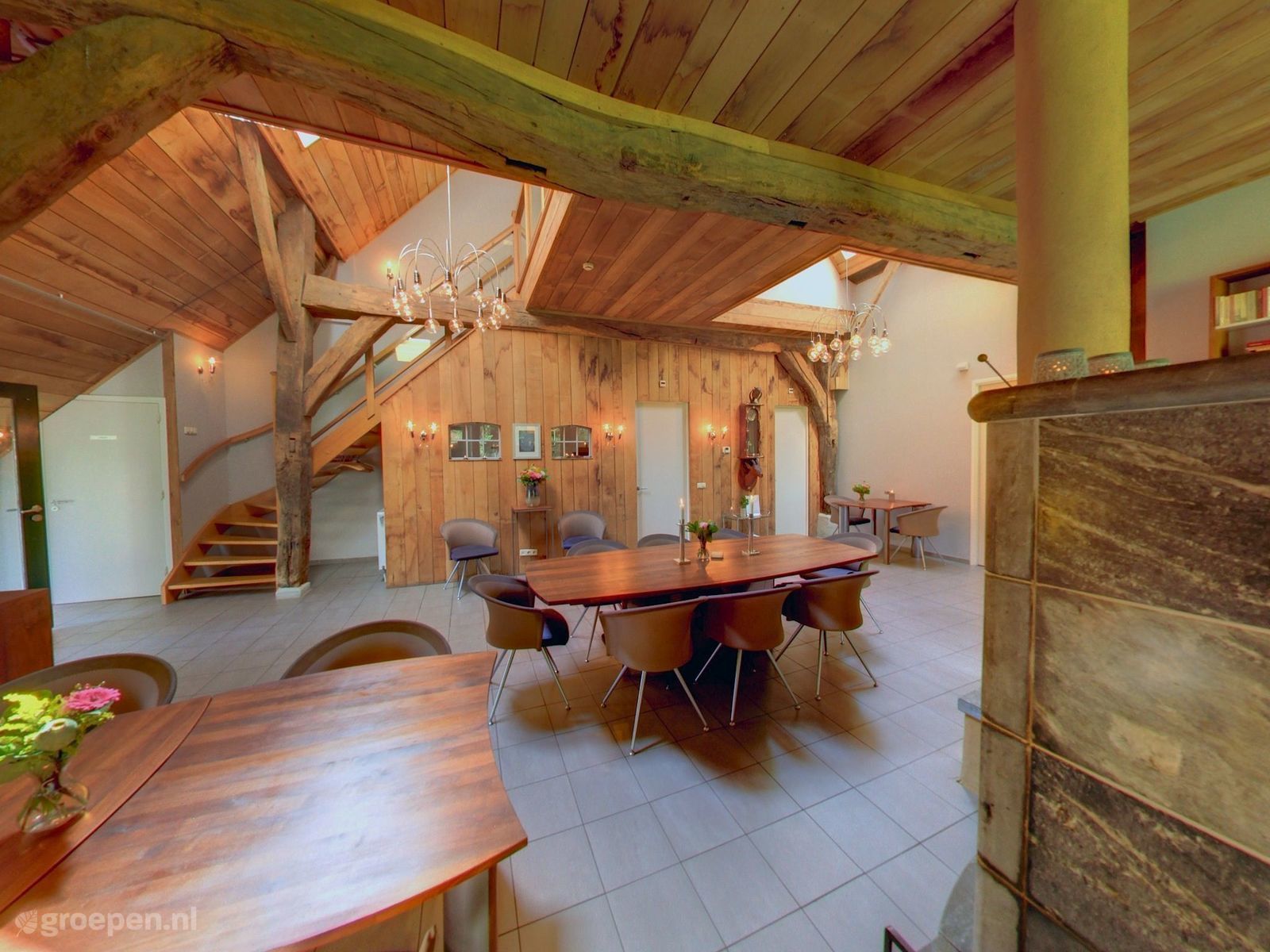 Would you like to rent a luxury nature house? Then come and enjoy a vacation among the hills in this deluxe group accommodation in Gelderland. From your luxury group accommodation, located on the outskirts of the village of Groesbeek, you have a view of the northern slope area and the Seven Hills Road. When you want to get away from it all and unwind you are in the right place at this cottage in nature. In fact, the group home has wellness facilities. Come relax in the relaxation room with sauna, whirlpool tub, infrared cabin and shower stall. Watch a movie together? Have you seen our cinema yet? With real cinema seats and good picture and sound, you will enjoy a real cinema experience. Experience a fine vacation in nature and among the hills in this luxury group accommodation with wellness.
